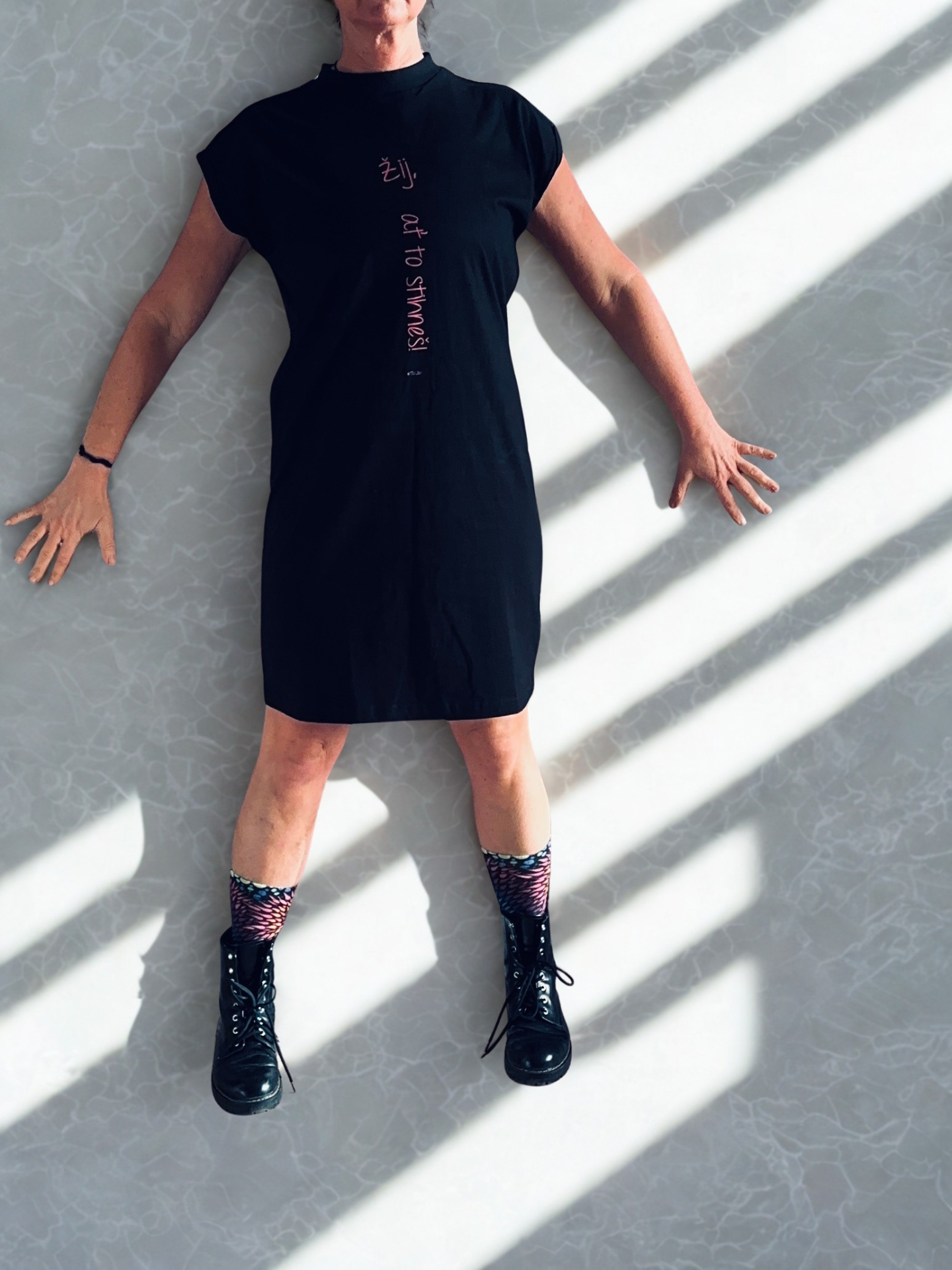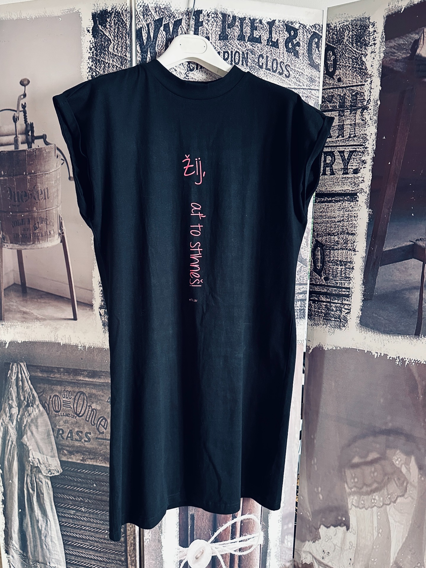Šaty- douhé triko s růžovým nápisem Žij, ať to stihneš! Velikost L .  Pokud máte ale rády volnější, tak doporučuji spíš pro vel. M .  míry L 92.5cm 55cm 702 Kč  Materiál: 100% bavlna (Heather Grey: 90% bavlna / 10% viskóza), Gramáž: 200 g/m². Moderní šikmý střih rukávů těsně nad ramena a drobný zvednutý límeček se hodí především pro neformální příležitosti, kdy máte ale pořád možnost se blýsknout ve velkém stylu.